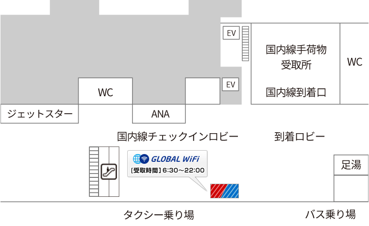 グローバルWiFiカウンター場所:1階国内線到着ロビー 総合案内所 営業時間 6:30-22:00